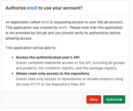 - After clicking on the “GitLab.com” button for the first time, you will get a popup from GitLab asking you to authorize the