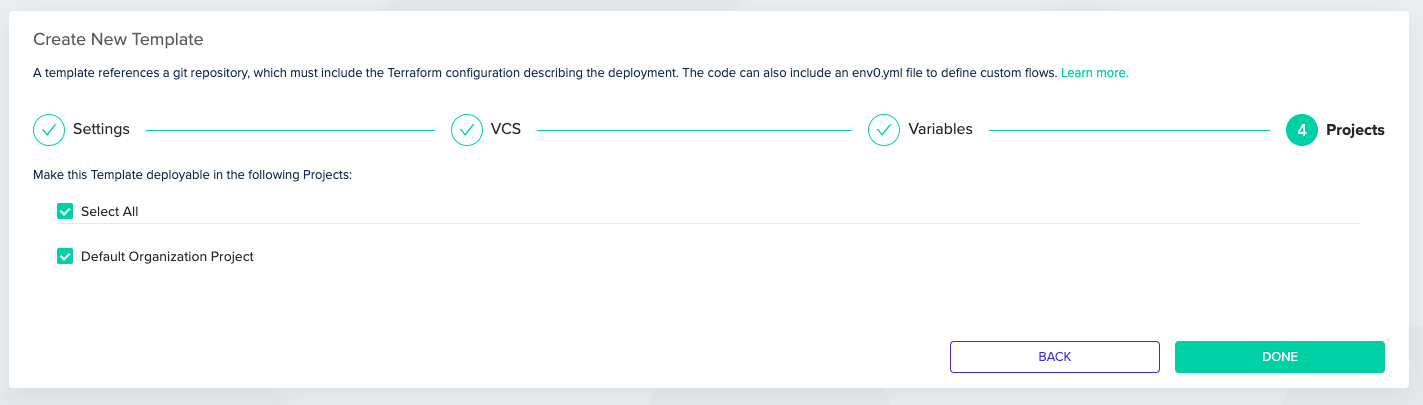 In order to run the template, you’ll need to add it to one of the organization’s Projects. Your new organization will already have a Default Project.- Go to the Default Organization Project