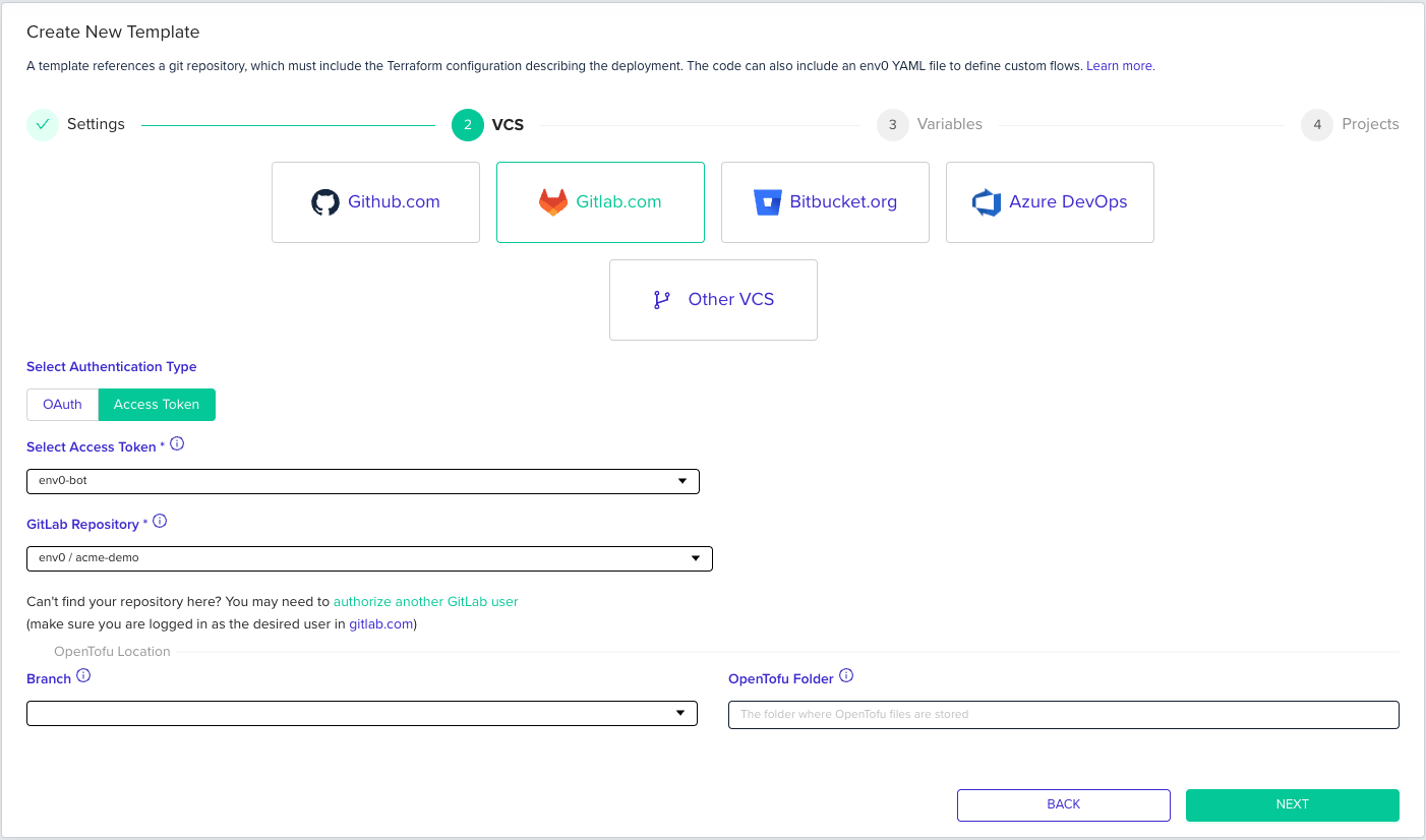 - Enter the URL to your Terraform repository that contains the code for this template under “Repository URL” - The URL can either be an HTTP/S URL or an SSH URL