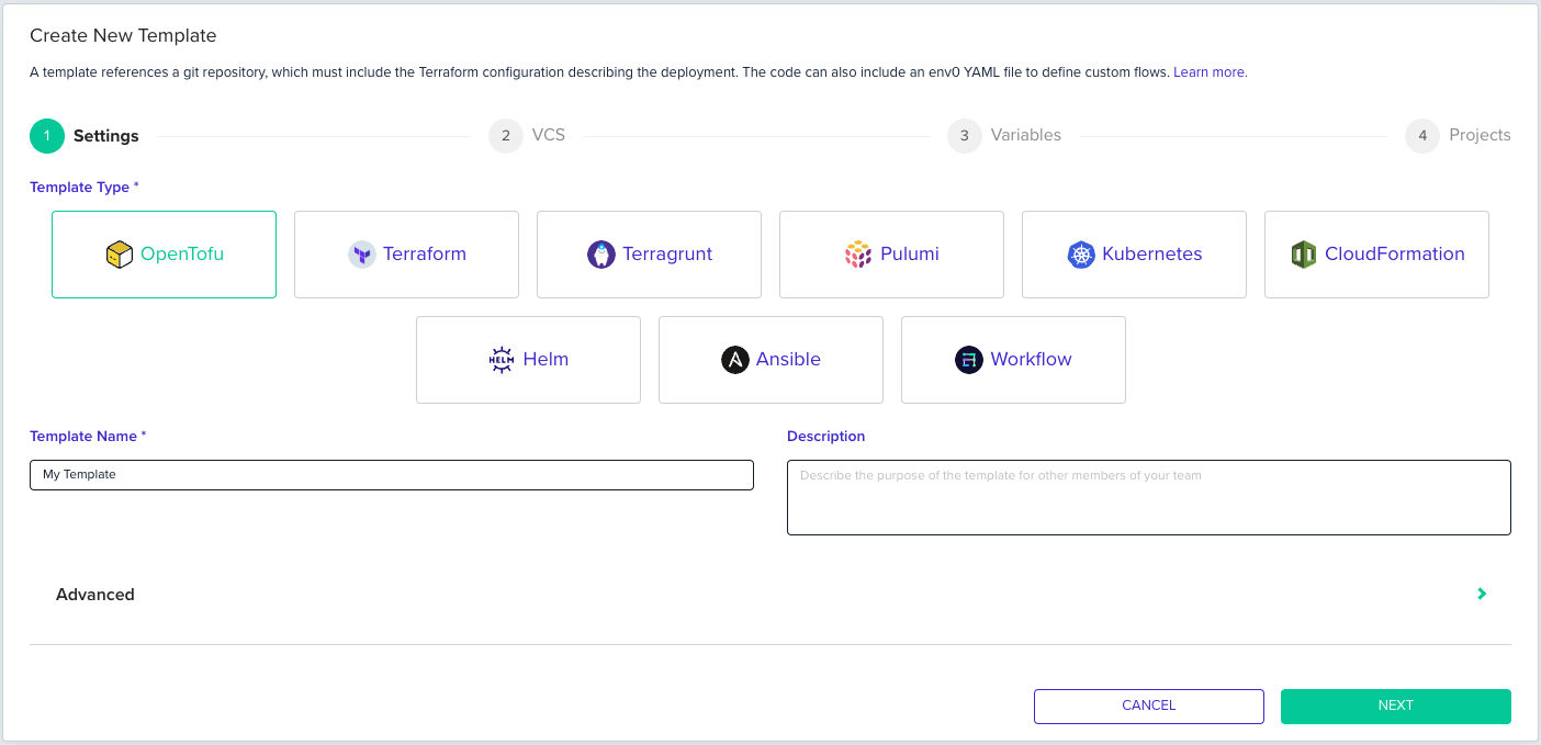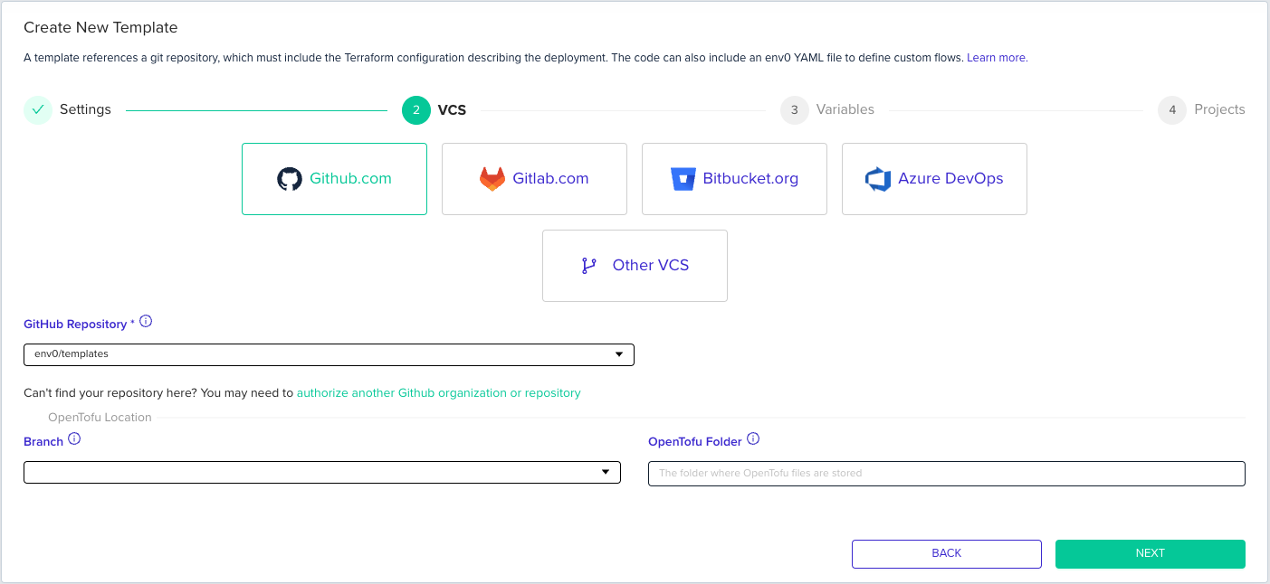 <IaC> Folder(IaC being the template type you chose earlier). If your IaC files are in the root of the repository, leave this empty. - Click on NEXT to go to the next step, Variables