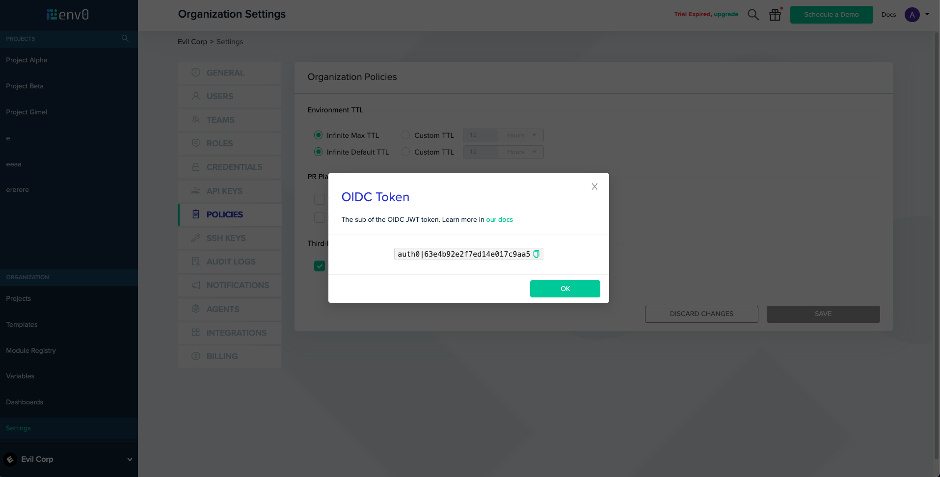 - Under Organization > Settings > Policy - Check โEnable OIDC during deploymentsโ\
