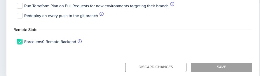 is enabled, all future Terraform environments in the current project will be created with a Remote Backend, which by default is not enabled.
