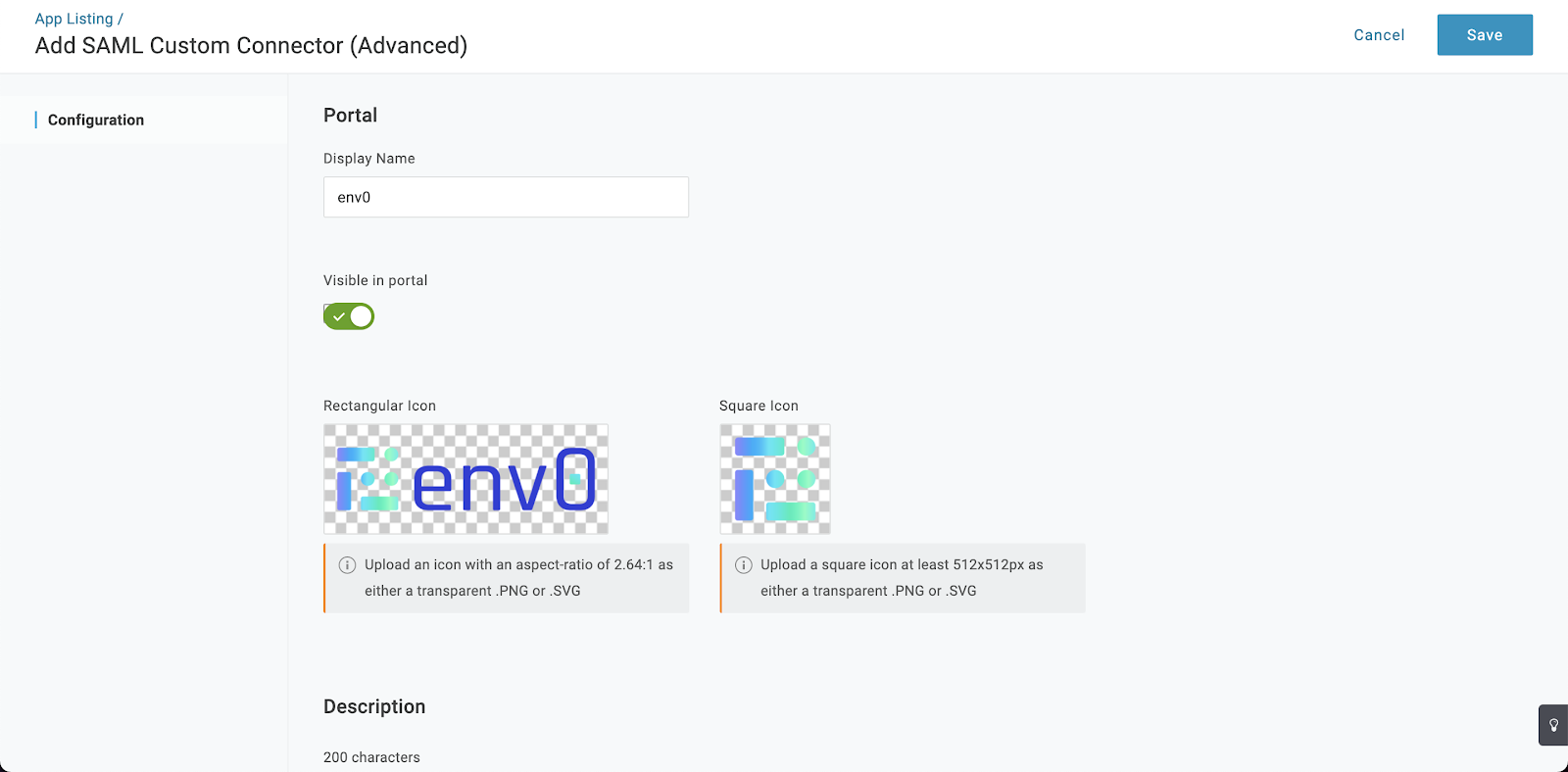 env zeroand upload an icon. - Enter a relevant description and click on the save button.